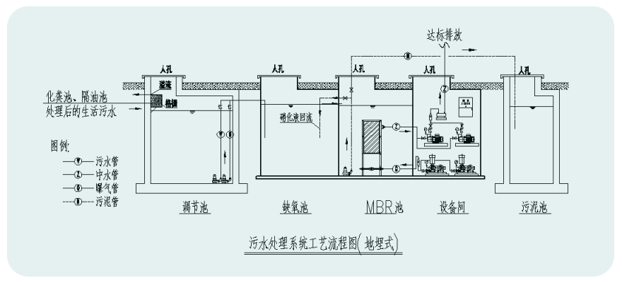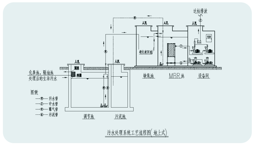 ● 分置式。將膜組件置于地下水池內(nèi);將風(fēng)機(jī)、抽吸泵、電氣控制部分置于地上設(shè)備間內(nèi)。