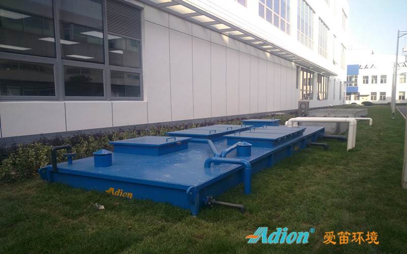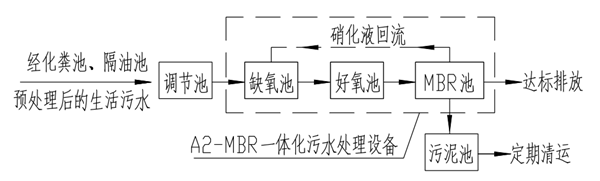 工藝流程 采用上海愛(ài)笛研發(fā)的A2-MBR污水處理設(shè)備作為核心工藝。在污水進(jìn)入設(shè)備之前需要預(yù)處理,根據(jù)生活污水水質(zhì)的特點(diǎn),對(duì)食堂污水進(jìn)行隔油處理;廁所污水進(jìn)行化糞處理。預(yù)處理后的水質(zhì)最終進(jìn)入反應(yīng)池內(nèi)進(jìn)行處理,出水可穩(wěn)定達(dá)到較高的排放或回用標(biāo)準(zhǔn)。